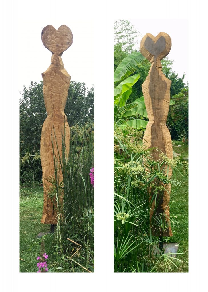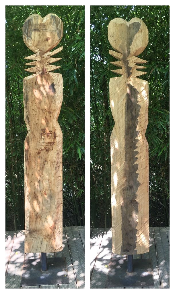 It seems to me that Celia Gouveaic, with the emergence of this work united by the so-called “Heart Souls”, brings us a face to face with effigies of urgency, that seem two-folded, knotting promise and mortal misunderstanding. These double sided statues function as apostrophes to our duality, our dualism and duplicity … Erect, they are dual, like the irrepressible reminder of a third way that simultaneously points out an alarming state of division. When the regressive and the archaic are taken up by the disturbing subjections of the political and the religious, it is the irreconciled parts of each one of us that is exposed to the risk of contrary and violent fascinations.